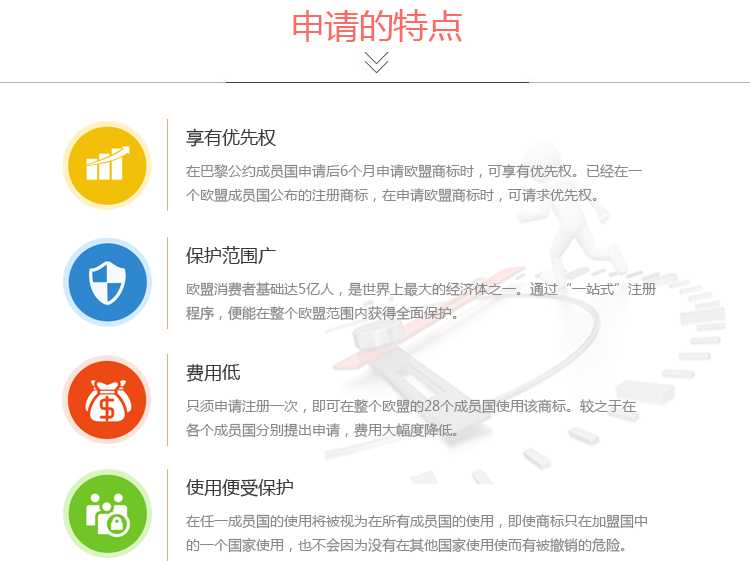 3、国际注册商标指定欧盟的异议期间改变自2016年3月23日起,马德里国际商标指定欧盟的异议期缩短,由原来的国际公告日六个月后的三个月以内,缩短为国际公告日一个月后的三个月以内。